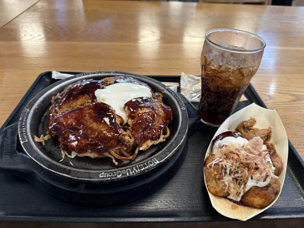 第3ターミナルはクレジットカード優待のラウンジが全くない。その代わりにフードコートの「ぼてじゅう屋台」という店は、プライオリティ・パスを使用できるので、3400円相当のお好み焼きとたこ焼き、鳥の唐揚げ、お菓子、ドリンクが無料で飲食できる。お好み焼きを食べたい気分でもなかったが、無料に誘われて頼んでしまった。味は良かったと思う。